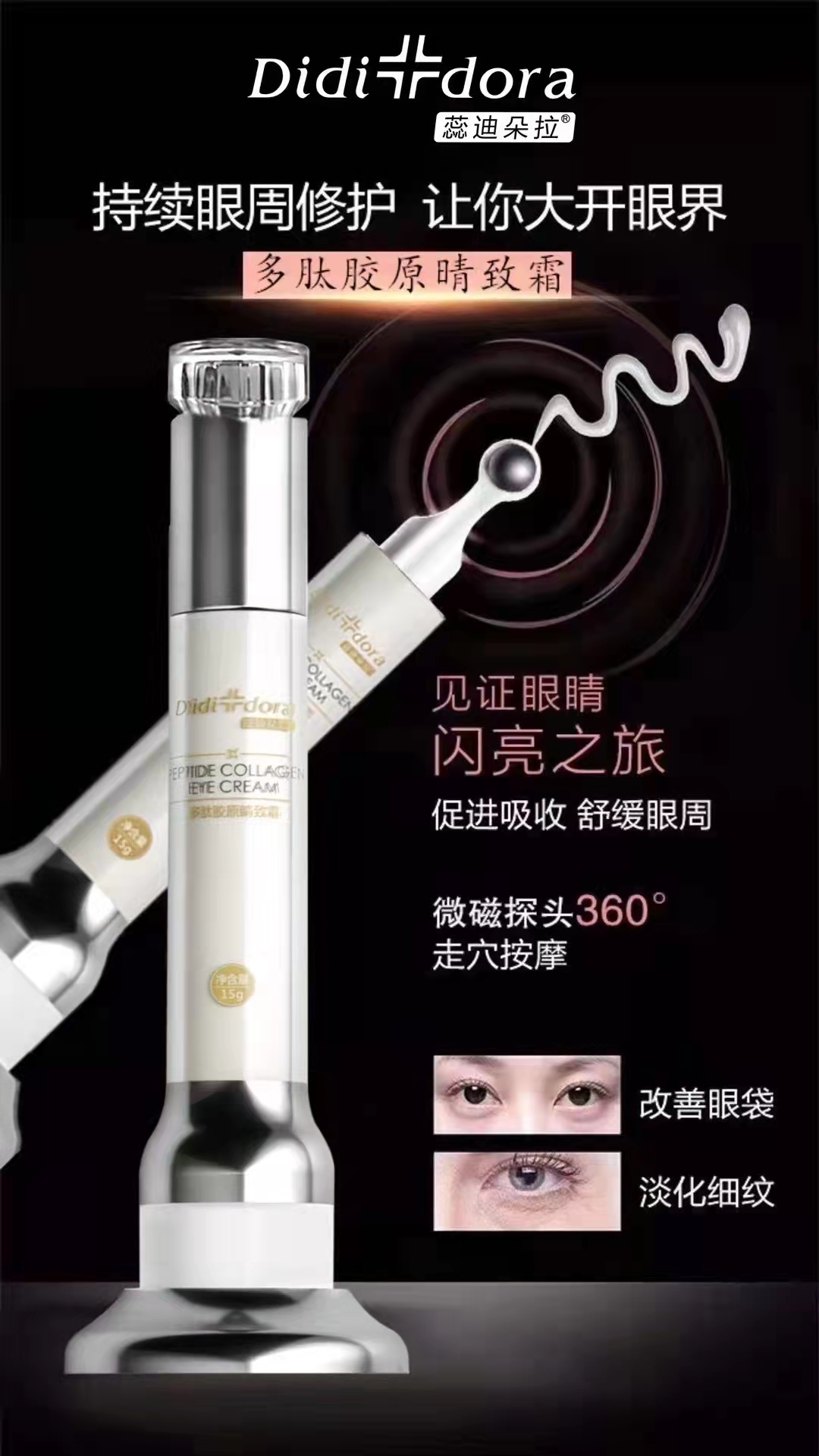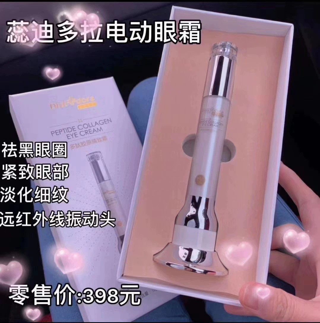 蕊迪朵拉電動眼霜介紹:賣點:滾珠式冰點設計,全方位按摩我們眼部穴位。可以更好我們眼霜的吸收滲透,通過眼霜按摩我們眼部可以促進血液循環,有效淡化黑眼圈,消除眼部水腫,緊致我們眼部肌膚的紋理。改善細紋,干紋,提前防止魚尾紋的生成。紅外線離子導入儀:萬次級高頻振,約數10萬次/分鐘高頻微振按摩加倍促進營養吸收,增強肌膚彈性,深層修復強韌肌膚。可以有效提拉眼尾,(淚溝和眼袋)肌膚,也可提拉臉部肌膚和精華導入。